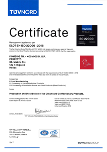 Για το σκοπό αυτό επιλέγουμε με αίσθημα ευθύνης τους προμηθευτές μας, φροντίζουμε οι συνθήκες παραγωγής, αποθήκευσης και μεταφοράς των προϊόντων να είναι σύμφωνες με τη διεθνή πρακτική, επενδύουμε στην ενημέρωση και εκπαίδευση του προσωπικού μας, ενώ παράλληλα αναπτύξαμε και εφαρμόζουμε Σύστημα Ποιότητας κατά ISO 22000 : 2018 πλήρως εναρμονισμένο με τις ανάγκες και τους στόχους μας που περιλαμβάνει τις δραστηριότητες από την παραλαβή των α΄ υλών μέχρι την διακίνηση των προϊόντων που παράγουμε.